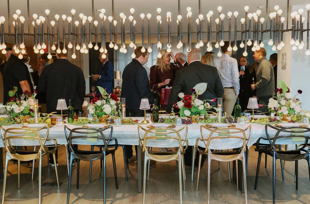 Designing the christening in Weehawken called for a graceful blend of reverence and warmth: lush peonies and hydrangeas provided a soft, romantic foundation while elegant white calla lilies introduced sculptural purity; clusters of grapes and pears were artfully arranged among the blooms to evoke a Last Supper sensibility without literal religious iconography, suggesting abundance and communal sharing. Low, abundant centerpieces allowed guests to see one another across the table, while tapered candles and strategically placed table lamps layered amber light to create an intimate, contemplative mood from ceremony through reception. Vintage brass accents and weathered wooden elements tied the modern-retro aesthetic together, giving the event a timeless, heirloom quality befitting a sacred family milestone. Photography by Jelo Pacana.