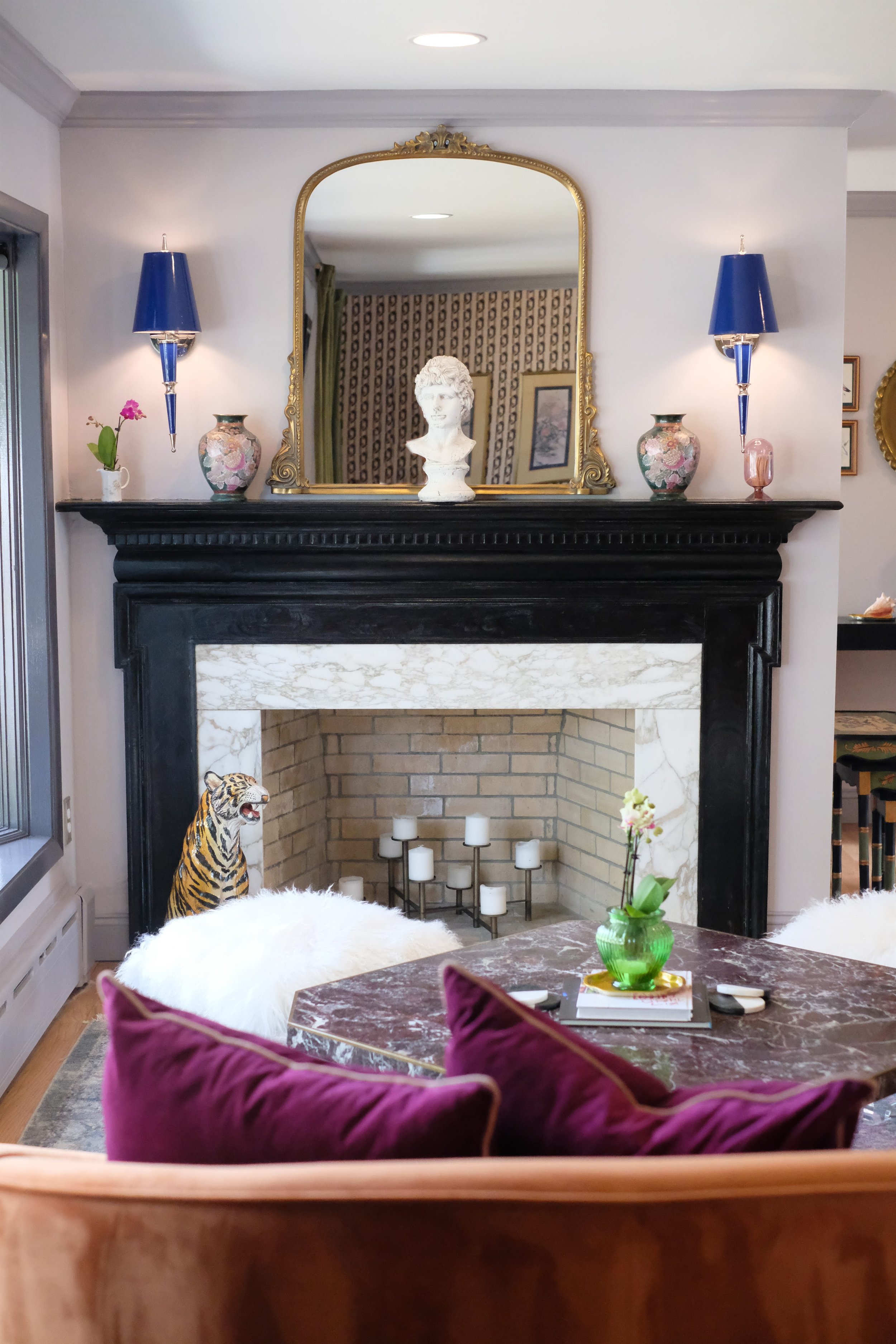 For years I loved the bones of this fireplace: the dramatic black mantel, the marble surround, the symmetry of the sconces, and the gilded mirror that gives the whole space a classic Parisian sensibility. But even with beautiful objects layered on top, the mantel always felt a little unfinished, as if it needed one more element to bridge the architecture with the more maximalist, storied style happening throughout the rest of the room.